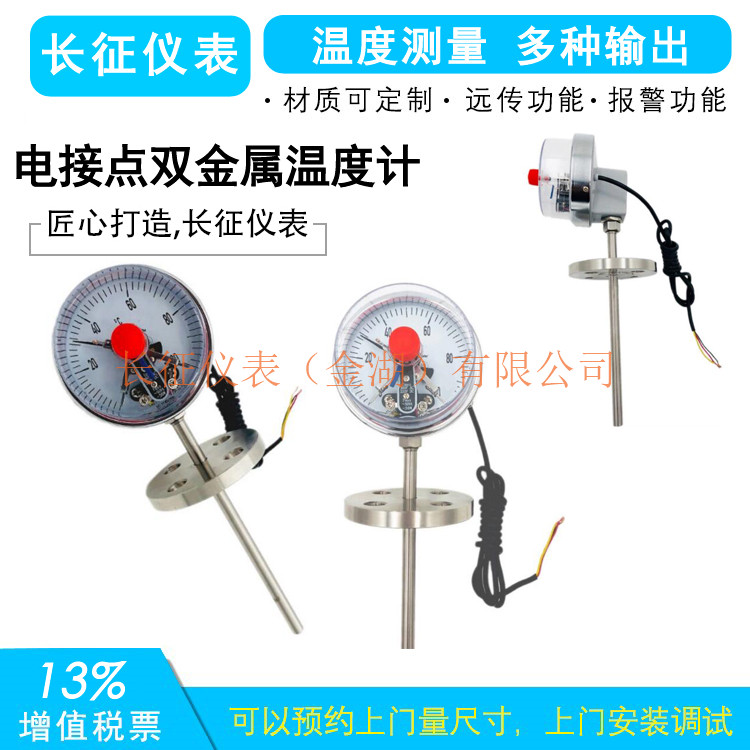 電接點雙金屬溫度計是利用溫度變化時帶動觸點變化,當其與上下限觸點接觸或斷開的同時,使電路中的繼電器動作,從而自動控制及報警。