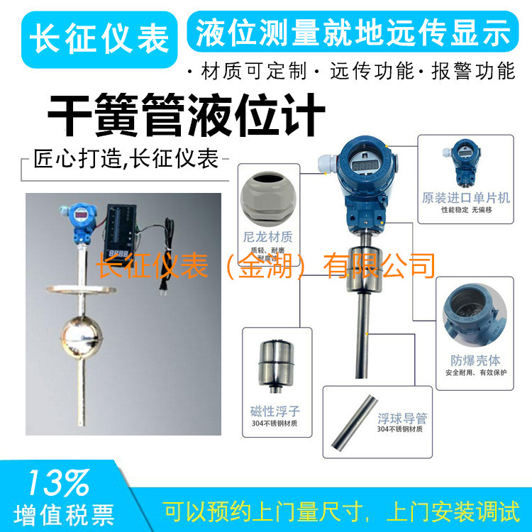 干簧管液位計,可用于開口/密閉容器或者地下池槽的介質液位進行就地測量指示,同時輸出標準電流信號,以兩線制或者三線制方式提供給控制室二次儀表。變送器由電子線路/測量桿和浮球三個主要部分組成,浮球中裝有永久磁鐵,測量桿中每隔一定距離安裝一只干簧管,由它檢測浮球的位置。