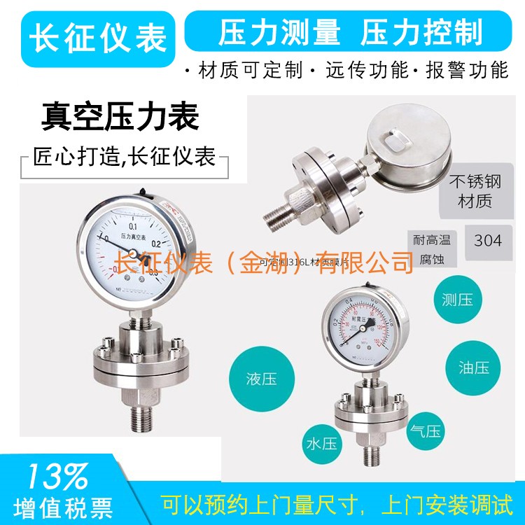 真空壓力表 以大氣壓力為基準,用于測量小于大氣壓力的儀表。真空壓力表適用測量無爆炸,不結晶,不凝固,對銅和銅合金無腐蝕作用的液體、氣體的真空壓力測量,不銹鋼真空表和不銹鋼壓力真空表用于測量對不銹鋼316,316L及0Crl8Ni12MO2Ti無腐蝕作用的液體,氣體介質的壓力和負壓,全不銹對環境有更強的耐蝕能力